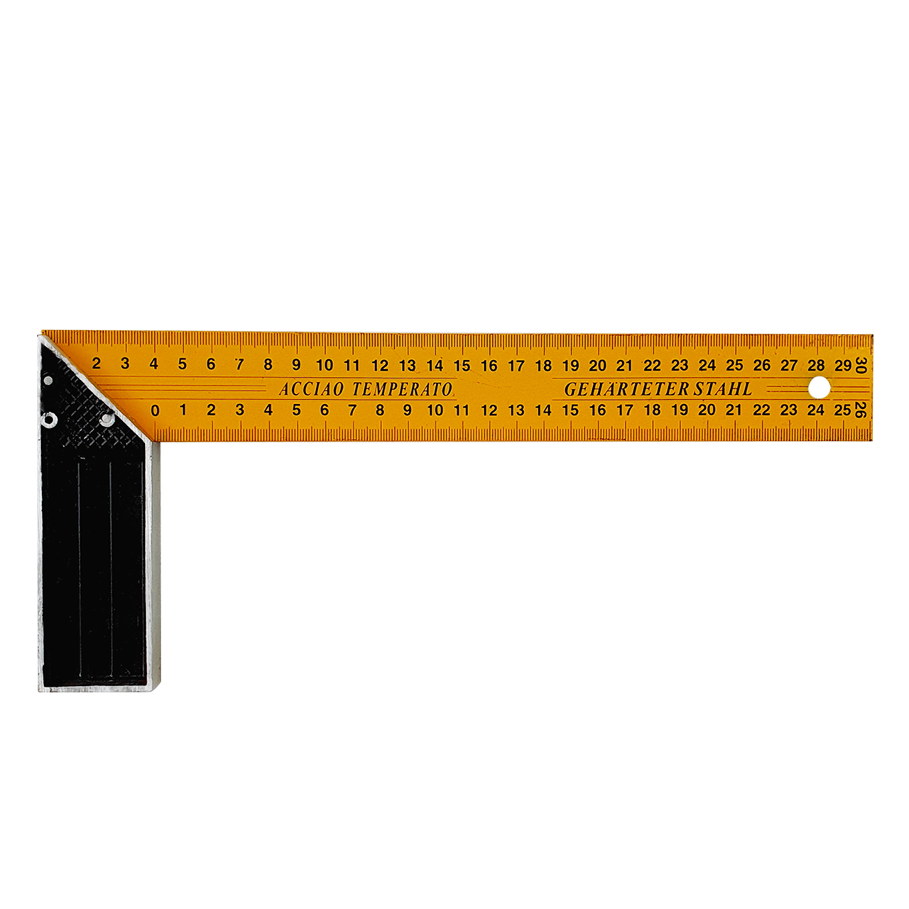 Угольник 300 мм состоит из гибкой металлической сантиметровой линейки, жестко соединенной с алюминиевым основанием со специальными пластиковыми ребристыми вставками.