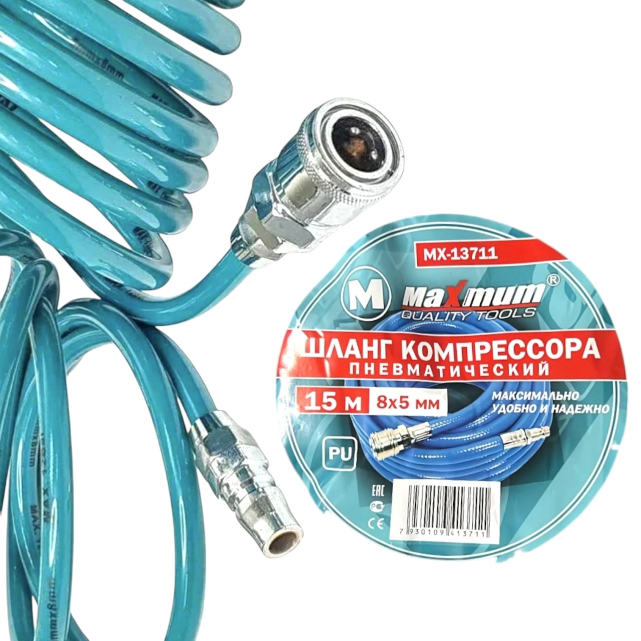 Шланг с фитингами рапид для компрессора 15 метров от "Maximum Quality Tools" выполнен из полиуретана. Шланг PU оснащен быстросъемными EURO разъемами, которые быстро и надежно соеденяют компрессор с различными насадками.